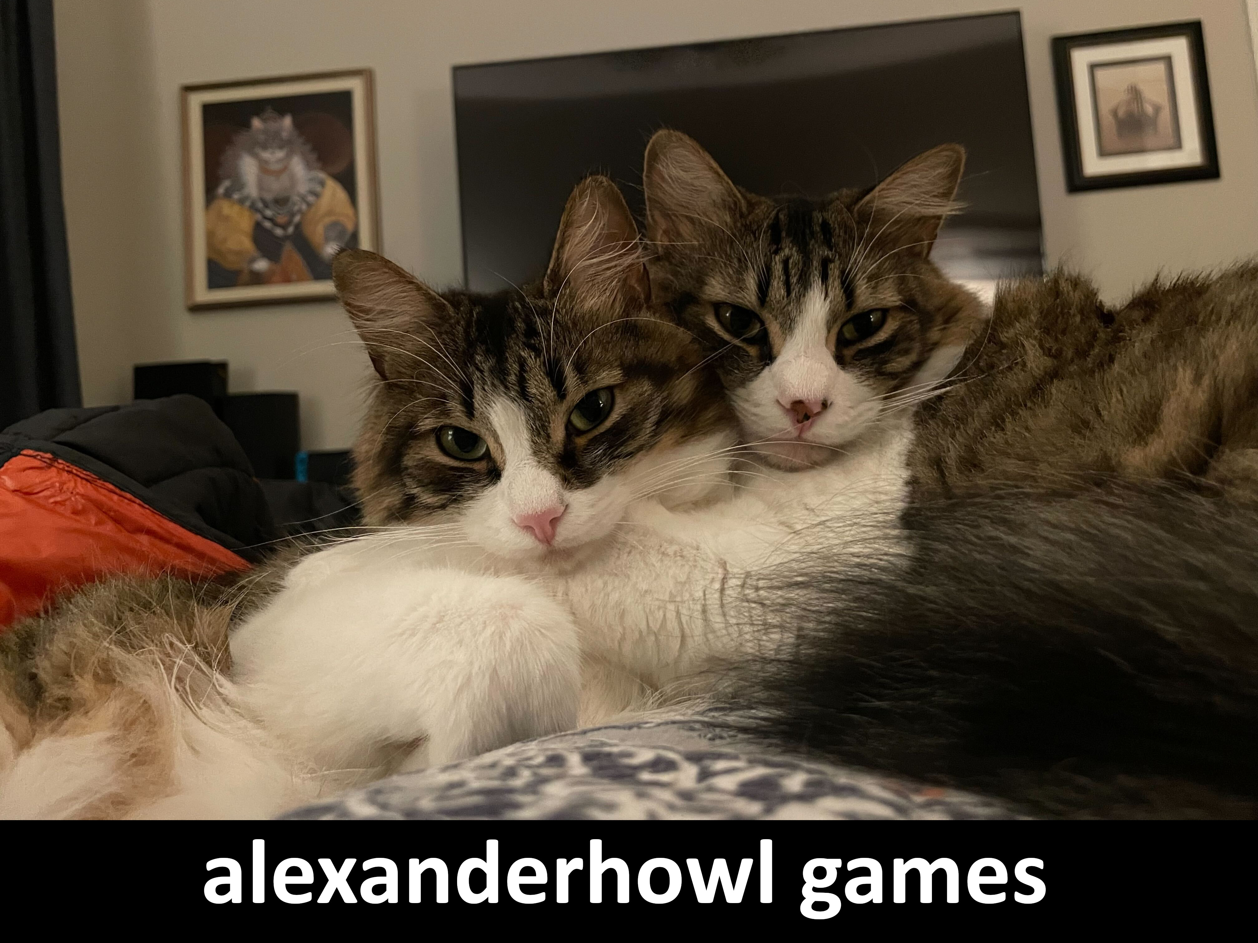 Hey! I’m Alex Howell, an independent game designer and developer who loves building weird, playful, and experimental games. More importantly, those two amazing cats are my boys Dug (pink nose) & Carl (spotted nose).